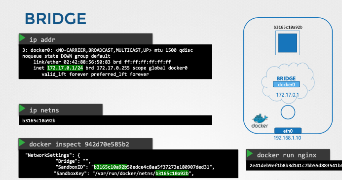 - 호스트의 네트워크 인터페이스 역할을 하며, 컨테이너의 가상 스위치 역할을 한다.
