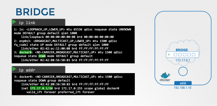 - 도커 호스트와 컨테이너가 연결되는 내부 사설 네트워크를 생성한다.