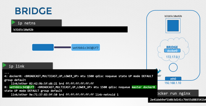 - 각 네트워크 네임스페이스와 브리지 사이에 가상 이더넷 쌍을 생성한다.