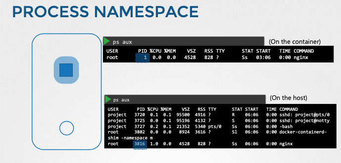 - 프로세스 ID는 네임스페이스에 따라 다르게 표시된다.