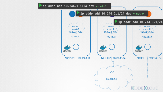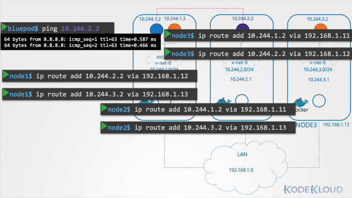 10.240.1.0/24,10.240.2.0/24,10.240.3.0/24) - 각 파드는 네트워크 네임스페이스와 브리지 네트워크 사이에 veth 쌍을 생성한다.