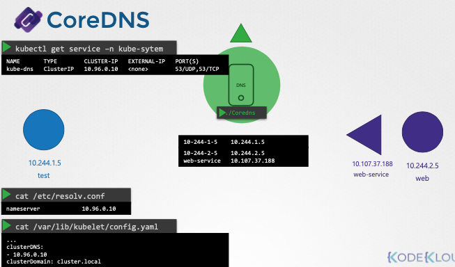 /etc/resolv.conf파일: 파드 생성 시 쿠버네티스는 자동으로 파드의/etc/resolv.conf파일에 CoreDNS 서비스의 IP 주소를 네임서버로 설정한다. - kubelet: kubelet이 파드의 DNS 설정을 담당한다.
