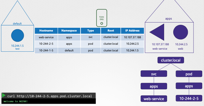 app)에 있는 경우, 테스트 파드는web-service.apps와 같이 네임스페이스를 포함한 전체 이름을 사용해야 한다.