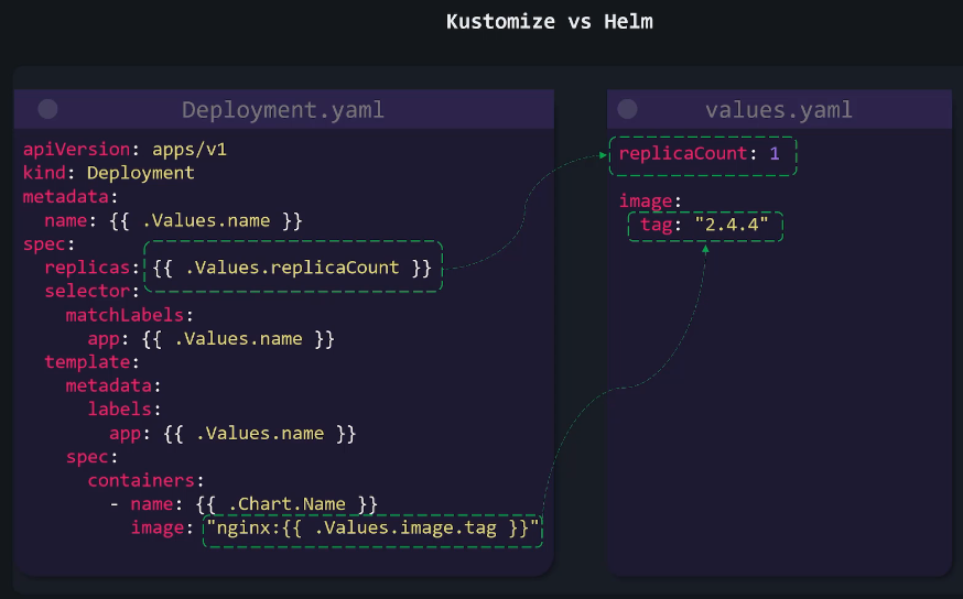 - 조건문, 반복문, 함수, 훅(Hooks) 지원: Kustomize보다 더 많은 기능을 제공한다.