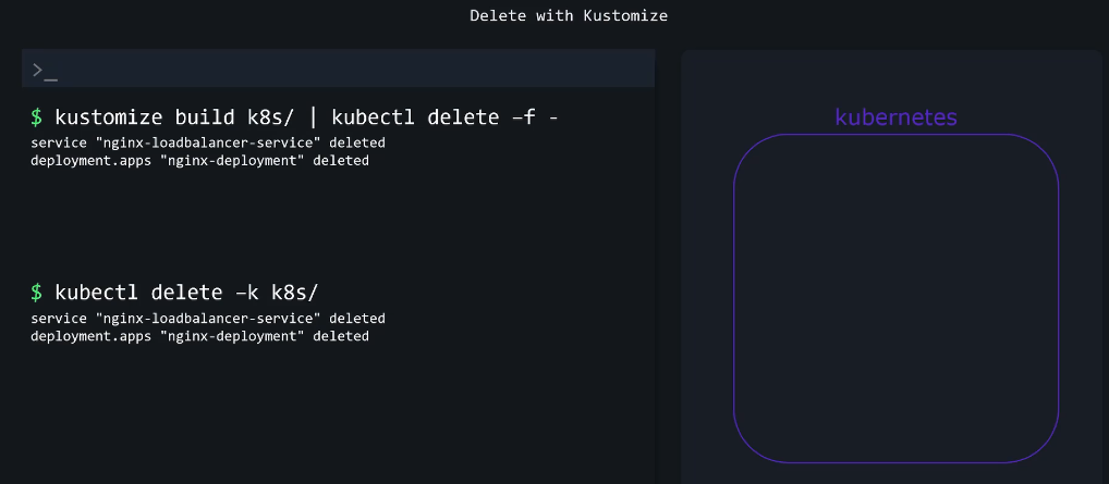 kubectl의-k플래그를 사용하여 직접 Kustomize 설정을 기반으로 리소스를 삭제할 수 있다.- 명령어는 다음과 같다.
