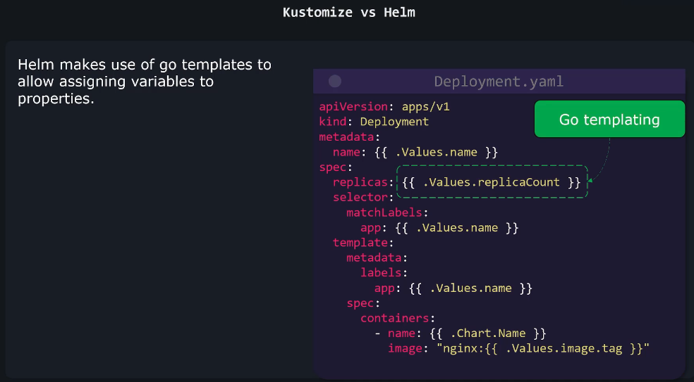 - Helm은 Go 템플릿 문법을 사용하여 쿠버네티스 매니페스트 파일에 변수를 할당한다.