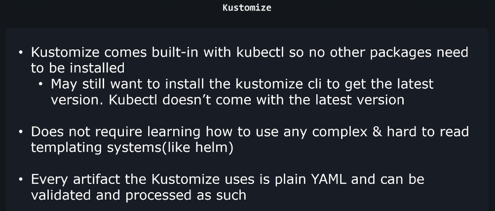 kubectl에 내장되어 별도의 설치가 필요하지 않다. (단, 최신 버전 사용을 위해 별도 설치 권장) - 단순성: 설정 변경 및 관리가 용이하다.