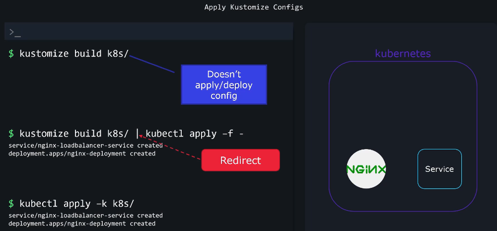 kubectl은 Kustomize를 내장하고 있으며,-k플래그를 사용하여 직접 Kustomize 설정을 적용할 수 있다.- 명령어는 다음과 같다.