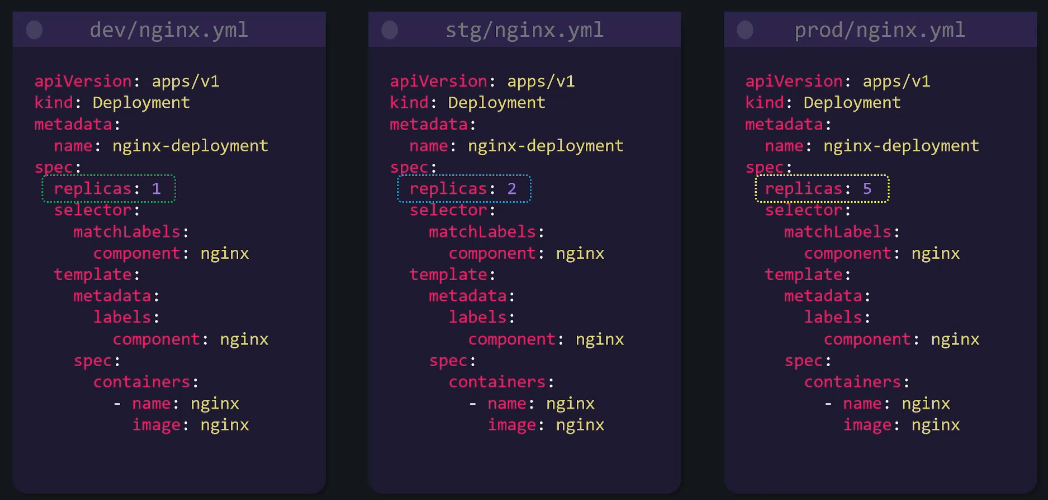 - 환경별로 설정 파일의 일부 값(예: replicas)을 수정한다.