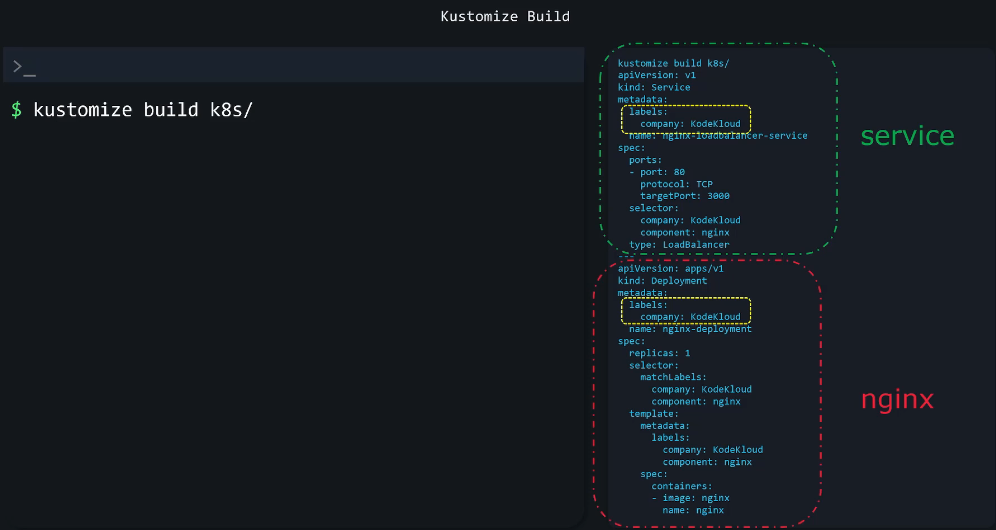 kustomize build명령어 실행 결과로 최종 쿠버네티스 설정 파일(YAML)이 터미널에 출력된다.- 출력 결과를 통해 변경 사항(transformations)이 올바르게 적용되었는지 확인할 수 있다.