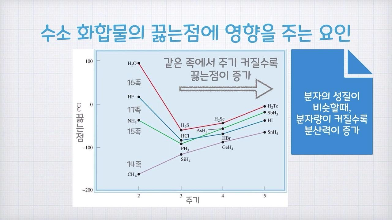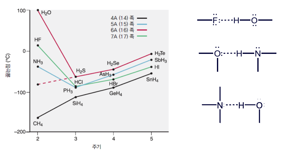 - 2์ฃผ๊ธฐ ($H_2O, HF, NH_3$): ๋ถ์๋์ ์์ง๋ง ์์ ๊ฒฐํฉ ๋๋ฌธ์ ๋๋์ ์ด ์๋์ ์ผ๋ก ๋๋ค.