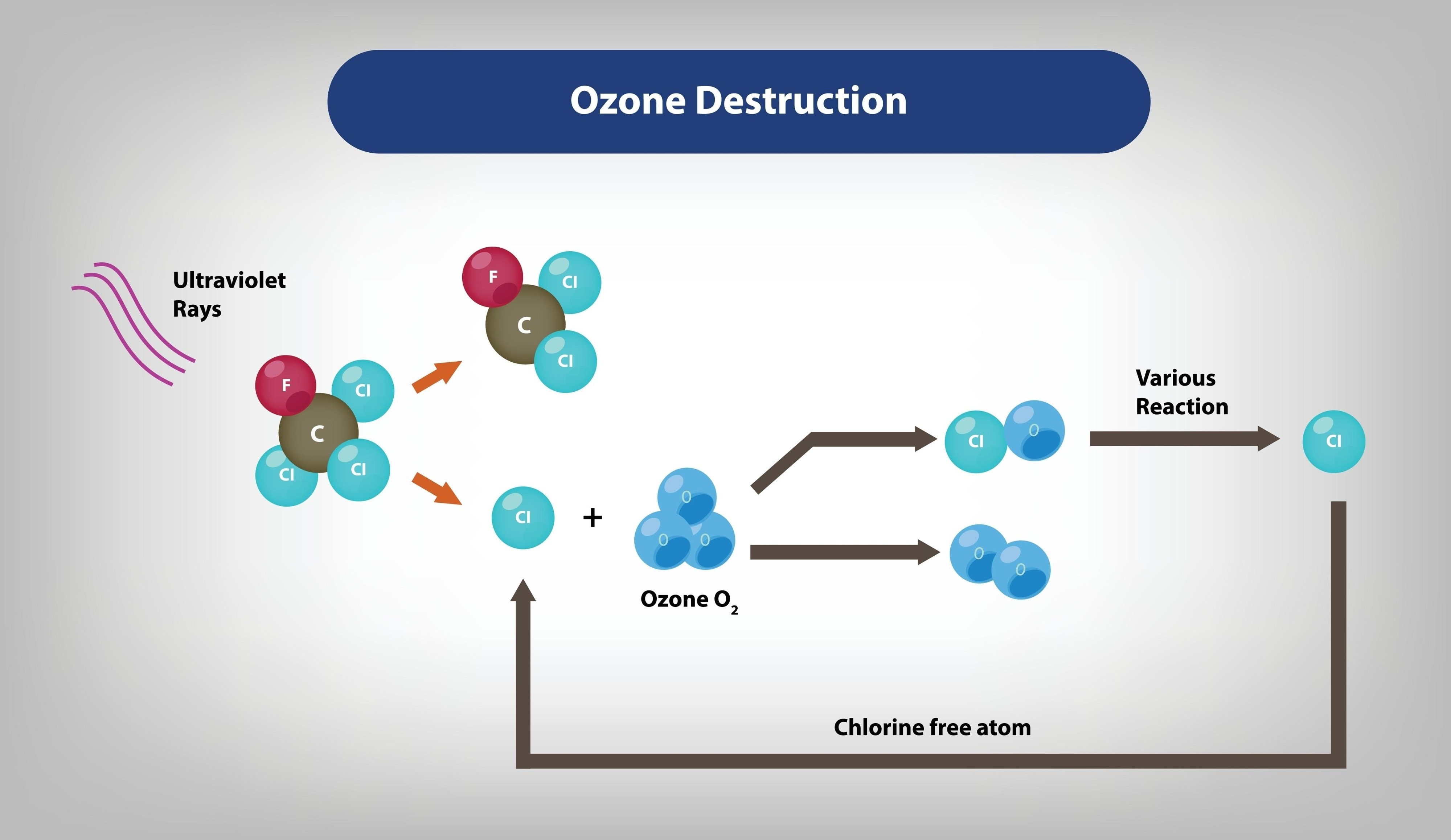 - ๋จ๊ณ 2: $ClO + O_3 \rightarrow Cl + 2O_2$
