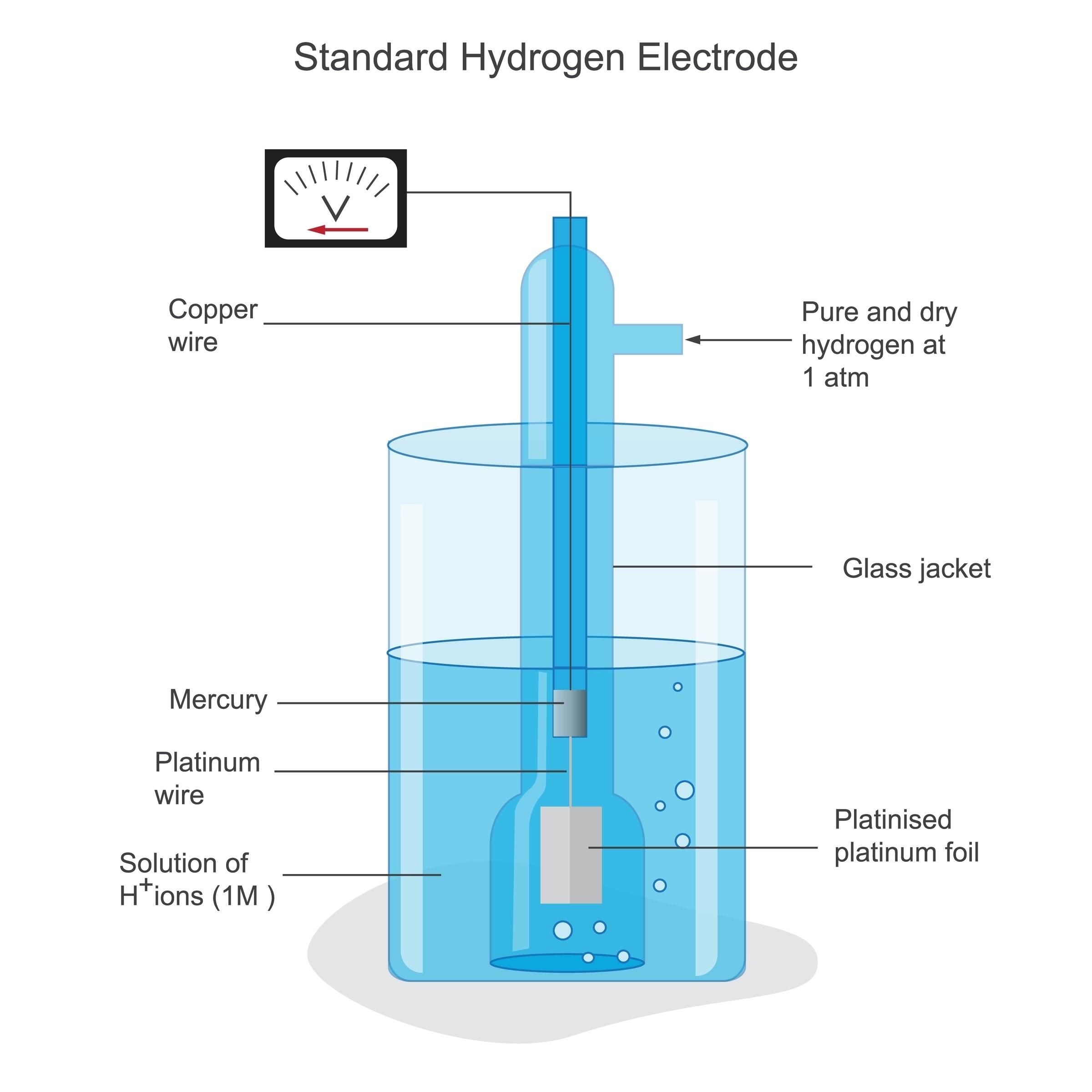 - $25^\circ\text{C}$, $1\text{atm}$, $1\text{M}$ 수소 이온($H^+$) 수용액에서 수소 기체가 환원되는 반응의 전위를 $0.00\text{V}$로 정했다.