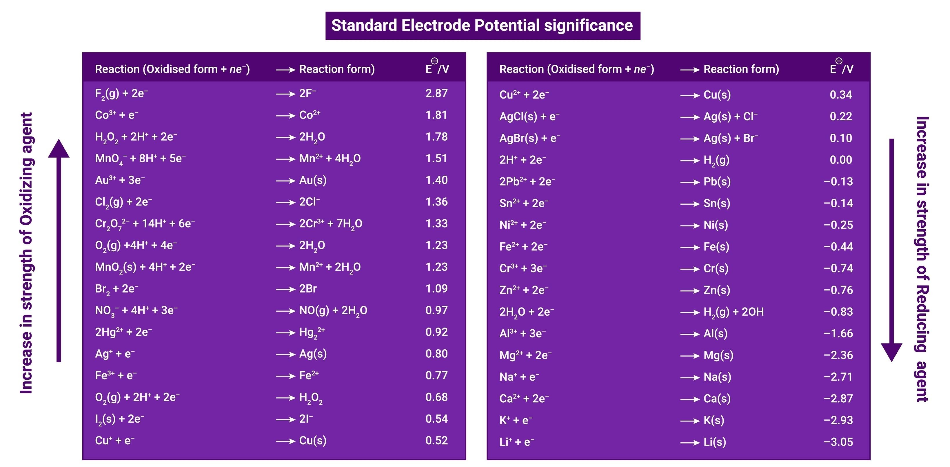 - 표준 환원 전위($E^\circ$): 값이 클수록(+) 환원되기 쉽고, 작을수록(-) 산화되기 쉽다.